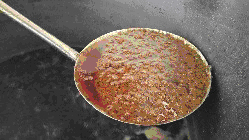 The making of Medicinal oil (Thaila), which is used mainly for external application, is a highly specialized task. The raw material (dry and fresh herbs) are sorted, washed thoroughly, dried, chopped and ground as required and simmered with water. The pulp is mixed with the appropriate base oil and simmered again – over several days until all the water has evaporated.The oil has to be taken off the fire at the correct time. If it is kept too long on the fire the oil gets burnt. If it is taken off the fire too early the oil becomes moldy.