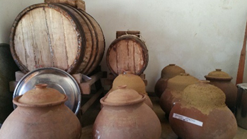 The fermentation process: the prepared juice of herbs and fruits is poured into clay pots and kept for a period of time until they are fermented.