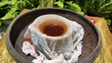 Straining of oil, during the medicine making process, and inspection of the rich color of the oil.